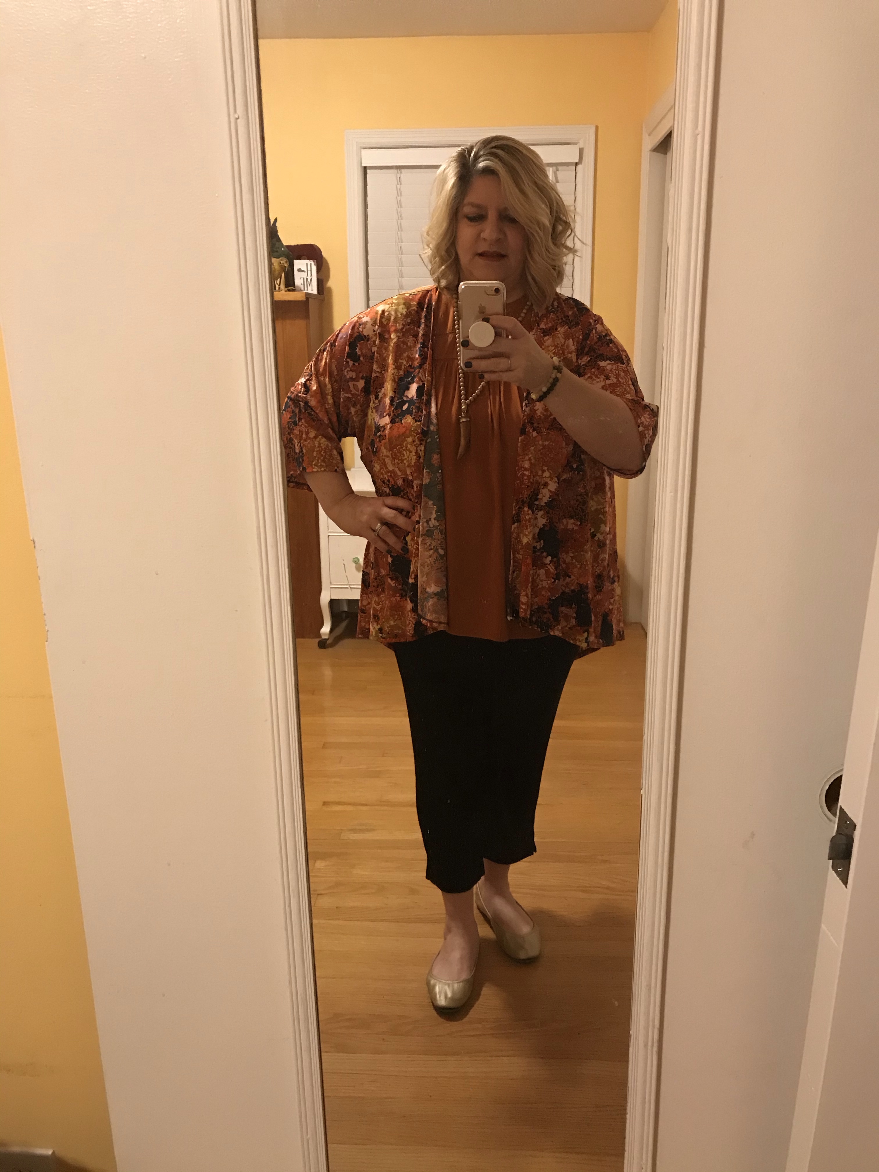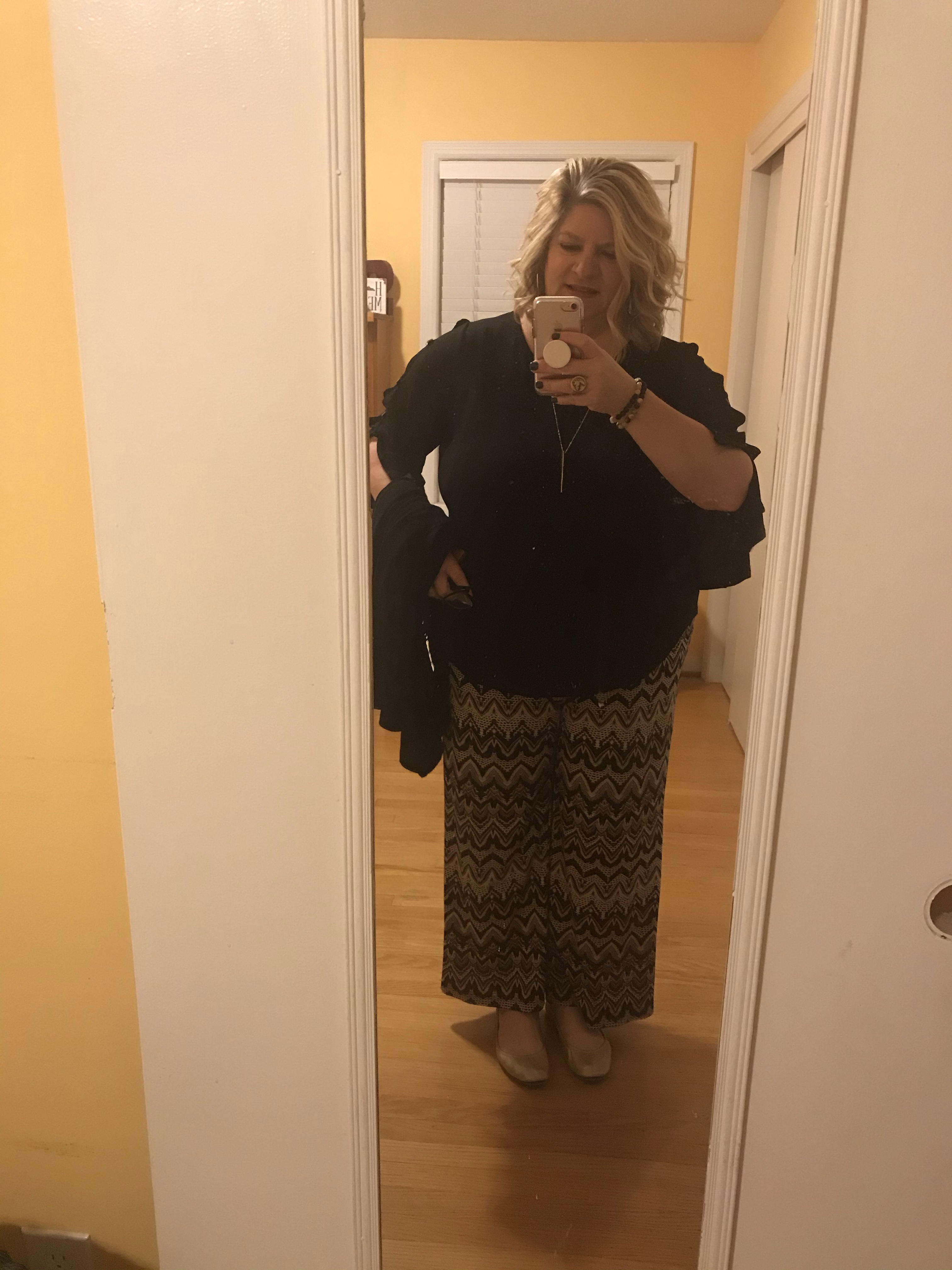 Also, I am trying not to change my nature and who I am and what I feel comfortable in. I like tops with black in them because I have lots of black pants. I prefer neutral shoes in brown, black, and metallics. These are what I wear the most.