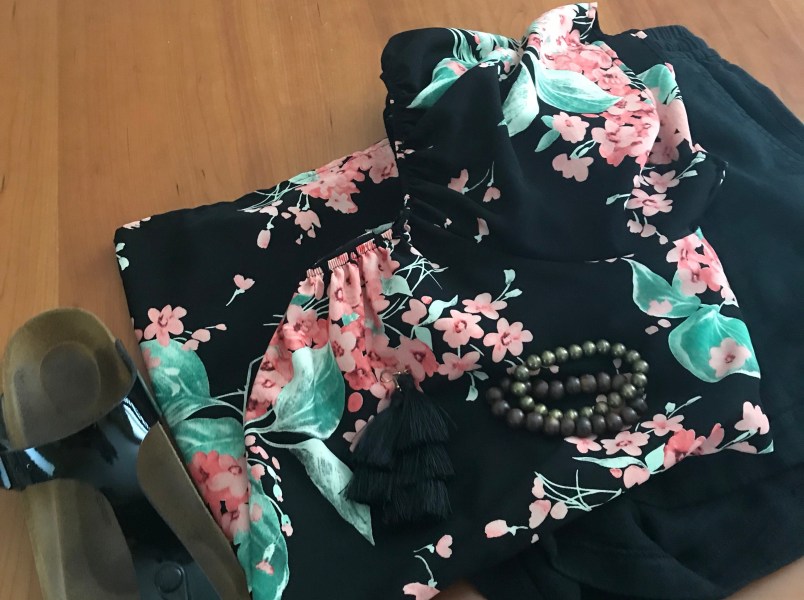 Next we have the same linen shorts from Old Navy from years ago but in black with a floral blouse from TJ Maxx last year. The black tassel earrings are from Amazon last winter and one of the bracelets was $1 at a consignment shop and the other is probably 10 years old so I don’t remember.