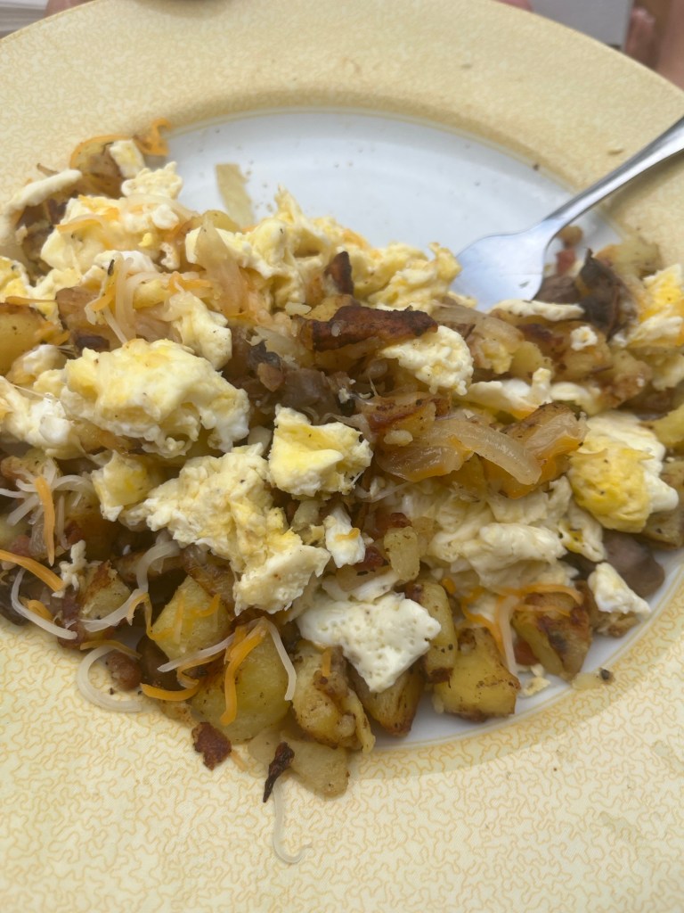 I love a slow morning. I love mornings and enjoy them so much and that makes me reluctant to plan to do things too early. I drink coffee and tons of water and then like to make my breakfast around 9-10. This is mushrooms, onions, potato, shredded cheese, one egg and some Bob Evans egg whites.