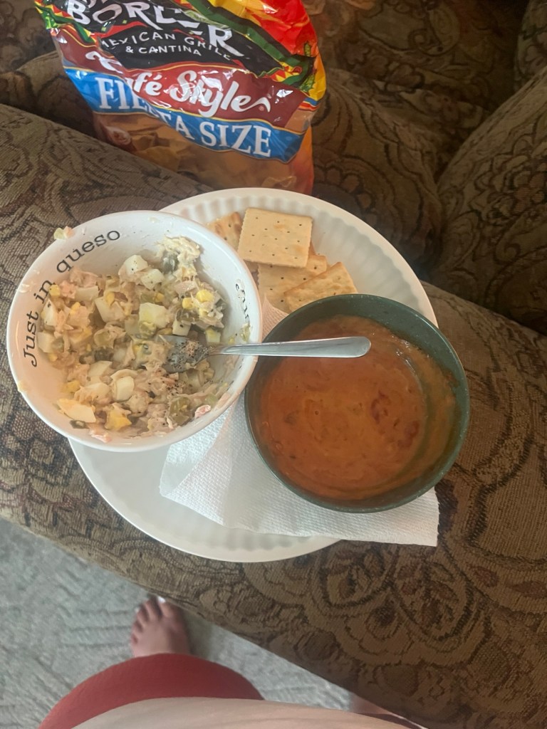 I am trying to figure out a better routine/structure. I am trying to eat more protein and healthier and lighter meals. I made tuna salad with a hard boiled egg and had some saltines this week. I made my Tostitos queso and jarred salsa mixture but I had run out of the Tostitos bite sized which are my preferred.