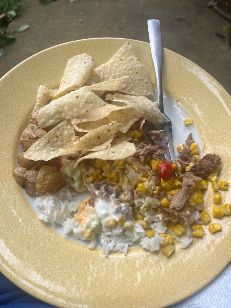 My favorite “home-cooked” (home heated up?) meal this week was Trader Joe’s carnitas, rice, corn, potato chunks, and Chick Fil A avocado lime dressing and sour cream. Tom requested we have it again!