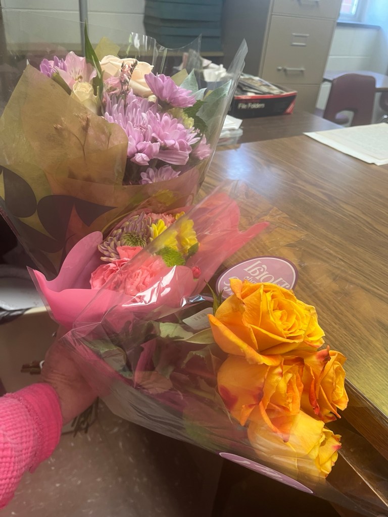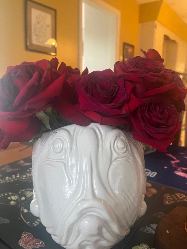 I would rather have a plant. I would rather have an interesting bouquet. Is that wrong of me? But, I did get a really beautiful peach rose bouquet from a student. Also, it doesn’t have to be a dozen. I do see the world through rose colored glasses sometimes because I am usually an optimist. I can get into a real Negative Nancy mode and no one likes that so I try to see the bright side.