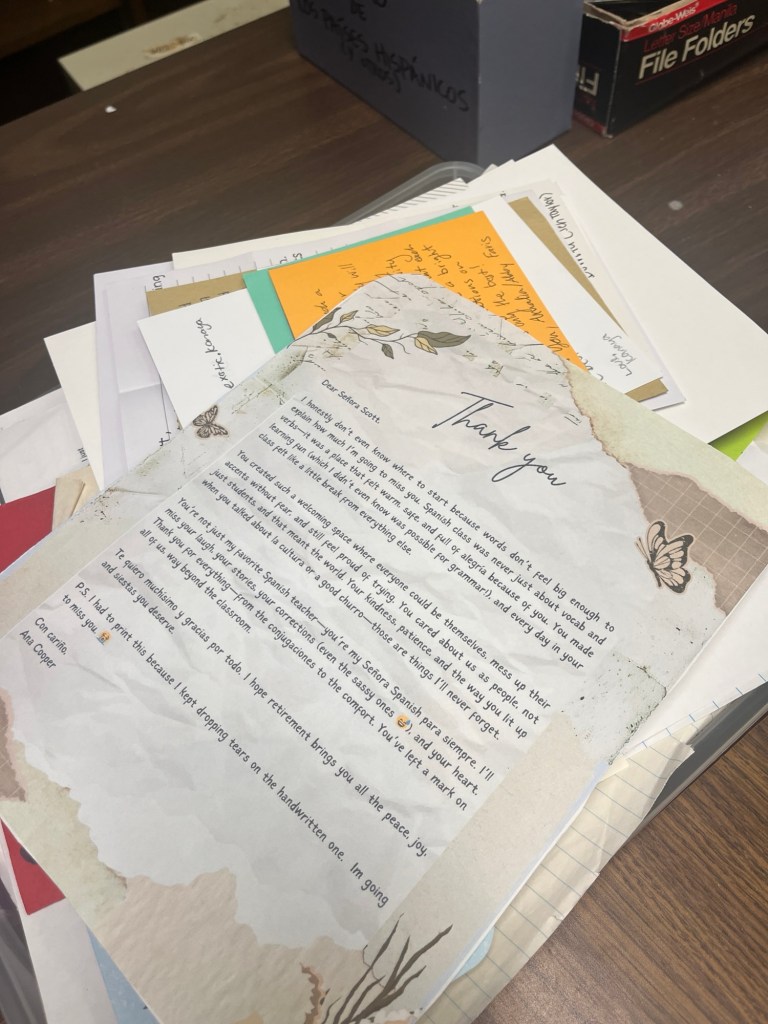 My room is almost totally wiped clean of any Spanish evidence. I have separated my sentimental stuff from my giveaway/trash/donation stuff and the Japanese teacher has started moving his stuff in. I received a really sweet and thoughtful message from a dear old friend about her mom’s teaching stuff in boxes in her garage. She advised me to pass my stuff along rather than keep it. So, I did a lot of giving things away and only kept what I think I will truly look at again. I have a box of photos and a box of letters and cards that are my main prize possessions.