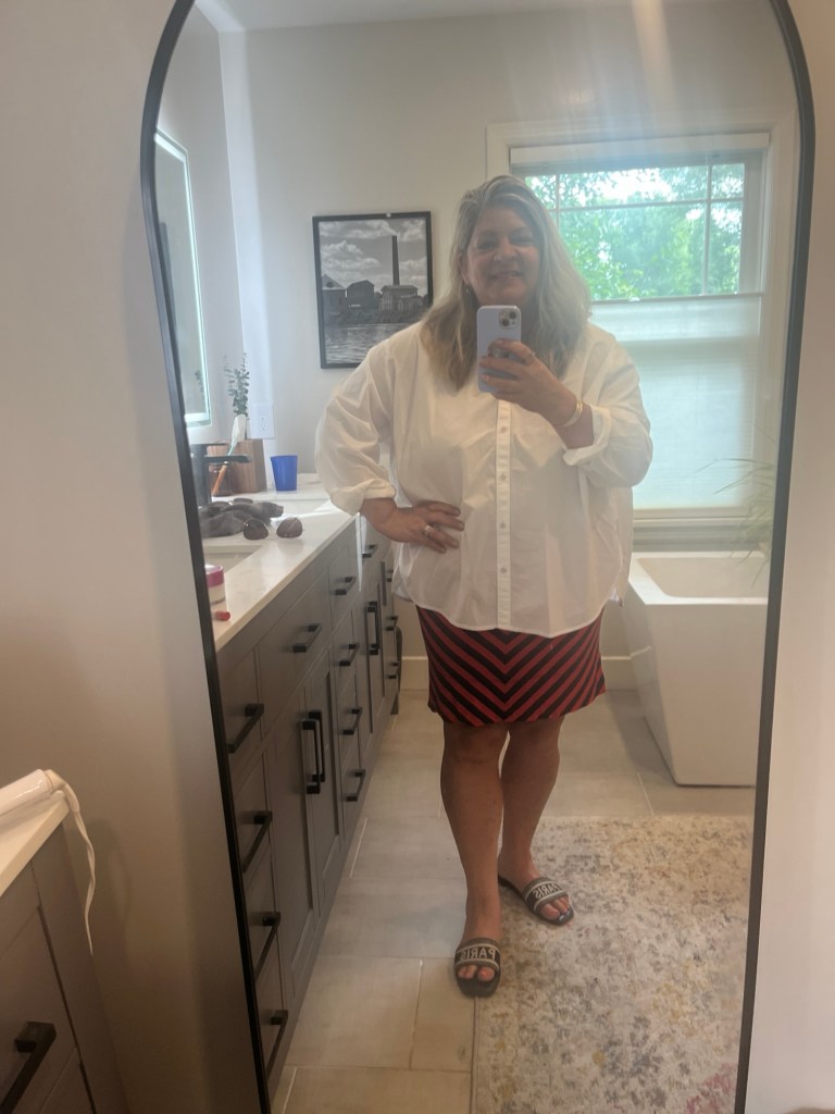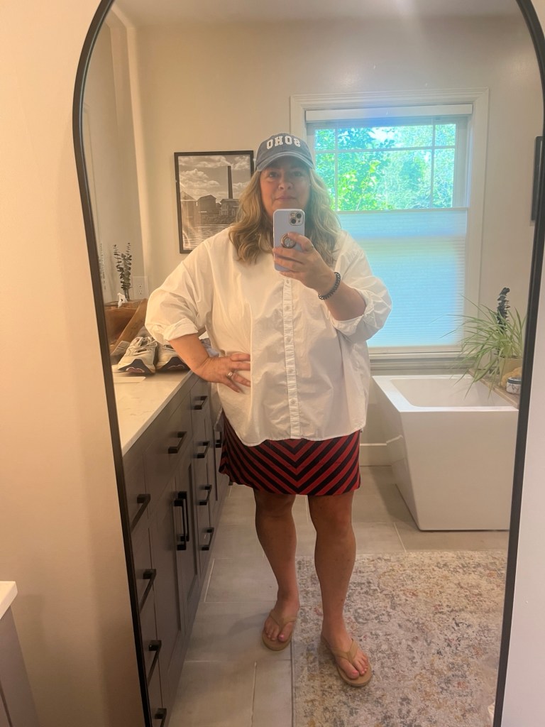 I have two Aerie white button ups and they are perfect. I bought a second because it was on major sale and I knew how much I was reaching for it. I also have a yellow stripe version. I pulled out this red and navy skirt for Memorial Day weekend and wore my Paris slides. I bought the Paris slides at TJ Maxx right before the Olympics for like $8.