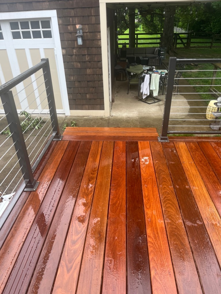 My favorite “room” is my patio and my deck. I can’t figure out what to call each of them. The lower patio is off the side of the garage and has a roof and ceiling fans and a table for six and a sectional. The deck is off of the mudroom on the back of the house. What do you think – patio for the lower and deck for the upper?