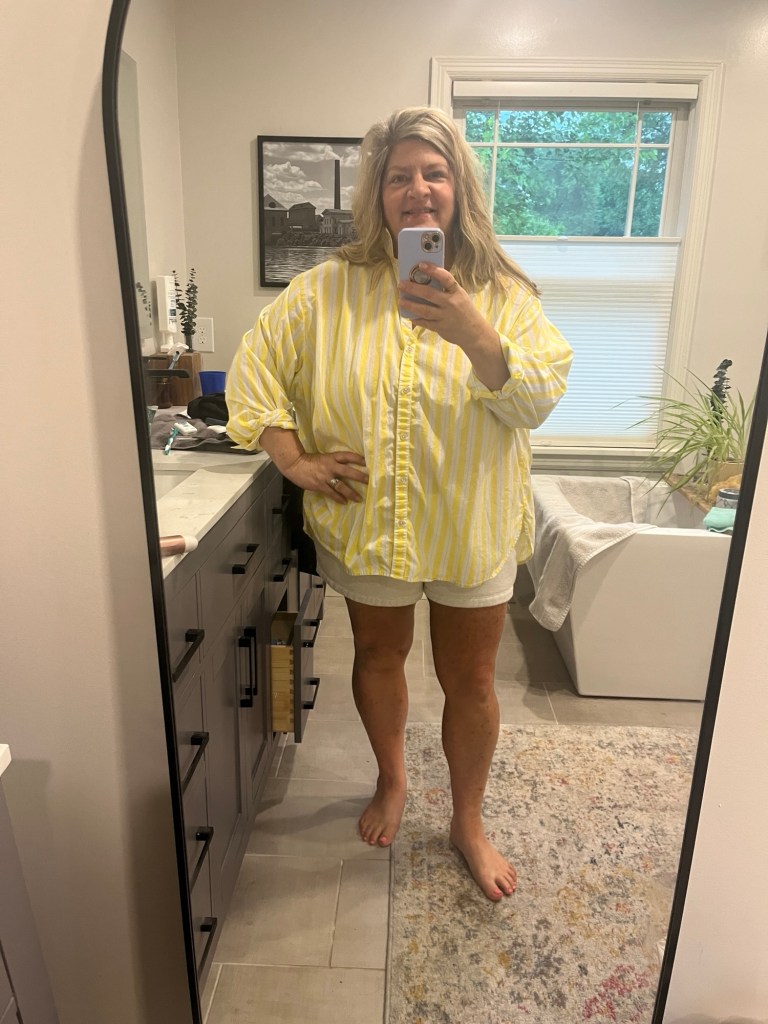 And, here’s the yellow stripe with my Wild Fable sweat shorts. I’m telling you I keep reaching for these button ups. It’s been pretty cool here so long sleeves with shorts or skirts is working.
