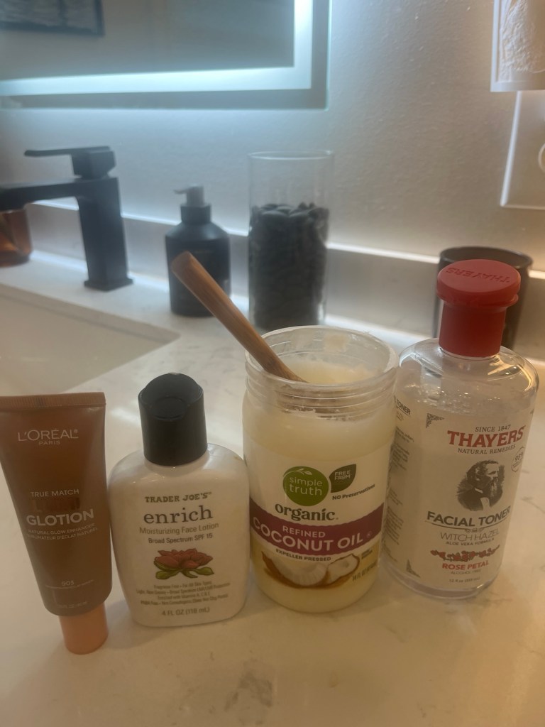 They are out of order. I put the coconut oil on my face both morning and night. I rub excess on my elbows. I also have not needed any sort of chapstick since using this because it takes care of my lips, too. It melts your makeup off and it makes your face so moist. I also have not experienced breakouts. It’s magic. Then, I put on the witch hazel with a cotton round. It is the rose scent and when Jen talked about it I was like – no, I do not like that smell, but it is really nice. My moisturizer on a normal day that I am not going to be outside is the Trader Joe’s 15. I go up to a 30 or 50 if I am going to be outside. And, then I recently started using the glotion and it’s good!