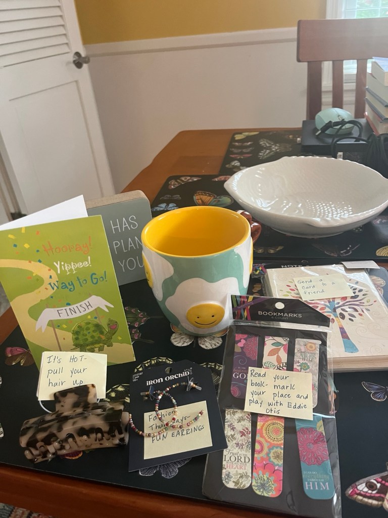 I got the biggest surprise in the mail! My dear reader and friend Sally sent me a retirement box! The gifts were perfect and the little notes were so thoughtful. I love when someone knows me and I feel seen.