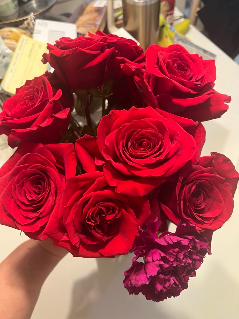 Tom surprised me with roses Sunday and they are just gorgeous. He also picked out a really nice card with the perfect wording for me. He is not a grand gesture guy, but I think he knew that I needed this this year.