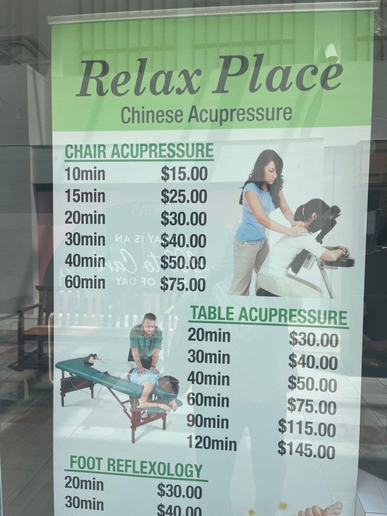 The service involved lots of hair washing and head massaging and a little bit of shoulder massaging and some metal tools on your head. She put an eye mask on me so she could have been running matchbox cars over my head.