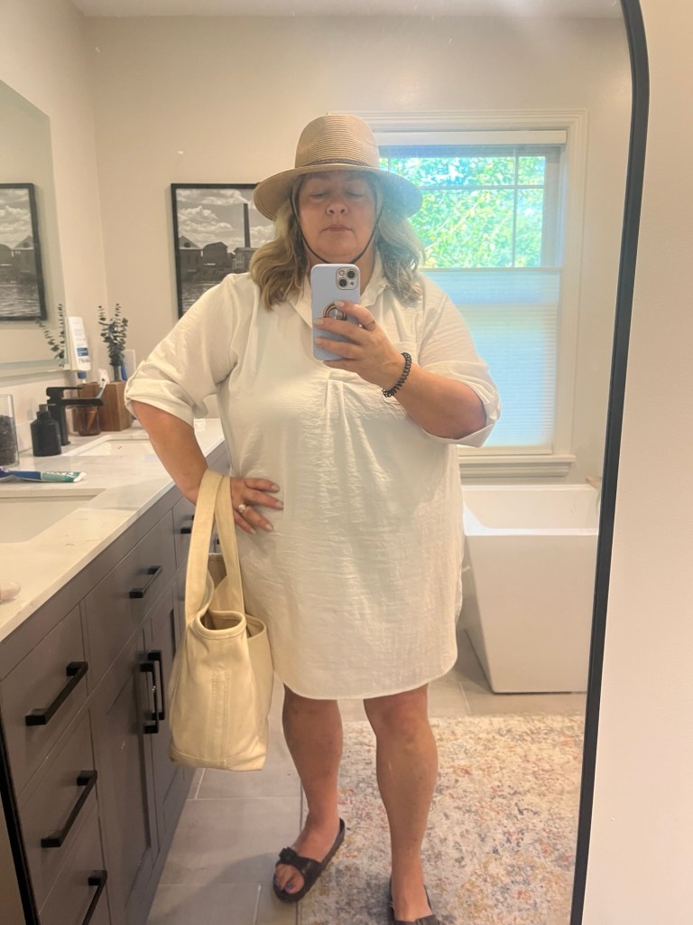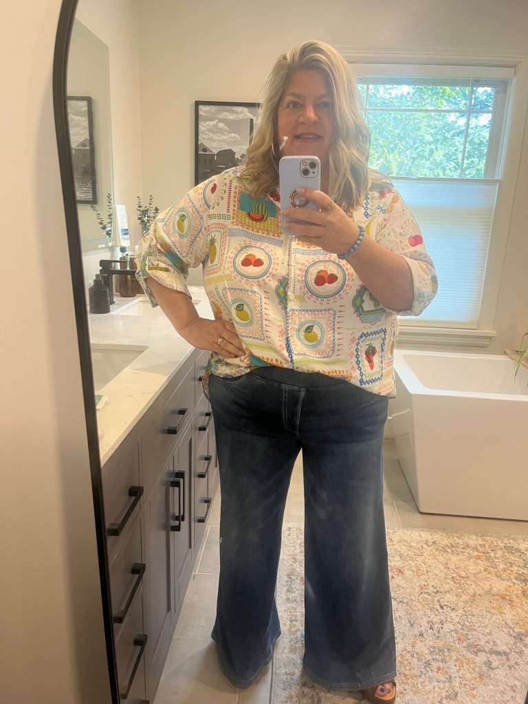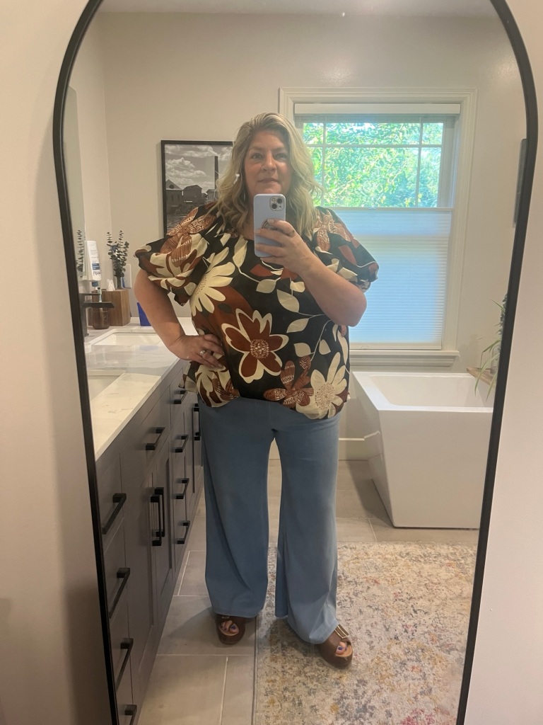I received a super sweet gift card from my college besties for my retirement gift. It was for a local boutique and they have Umgee and Entro and some other boutique brands that I like. I finally made my decision a few weeks ago and picked this fall blouse but notice the short sleeves so women of a certain age don’t get overheated. I wore it out to breakfast with my former student. I have on the blouse, my light Halaras, and my Kork Ease sandals that have proven to have been a good purchase. I thought they would be good as we go into fall.