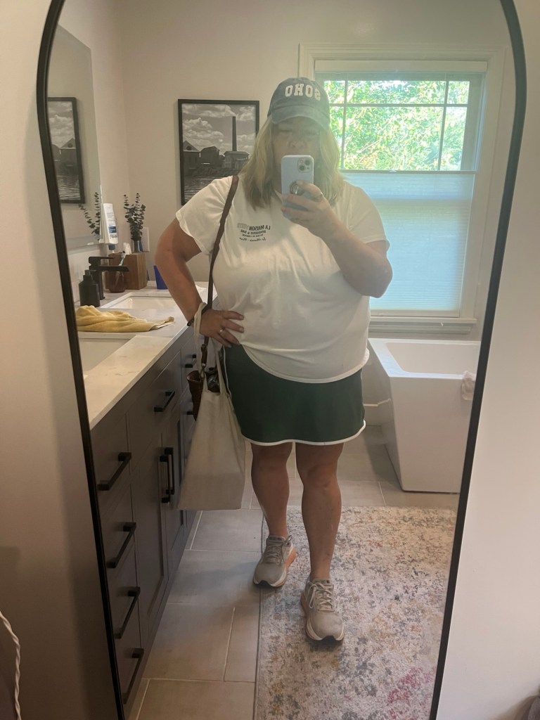 Saturday walk, library, and farmer’s market outfit is up next. I have on my Old Navy tennis skirt, an Old Navy graphic tee, and my JC Penney SOHO ball cap.